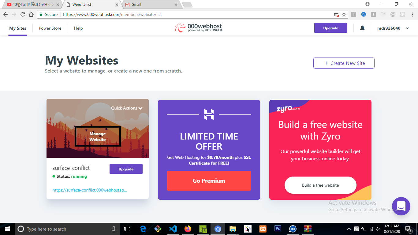 তাহলে আপনার একাউন্টটি সঠিকভাবে খোলা হয়ে যাবে এবং আপনি একটি ফ্রিতে ডোমেইন এবং হোস্টিং পেয়ে যাবেন। আর একটা কথা হলো আপনি একটি একাউন্ট দিয়ে একটি ডোমেইন এবং হোস্টিং পাবেন। এবার আপনি যদি আপনার ওয়েবসাইট ম্যানেজ করতে চান তাহলে পেজে থাকা অপশন গুলো থেকে Manage website বাটনে ক্লিক করুন।