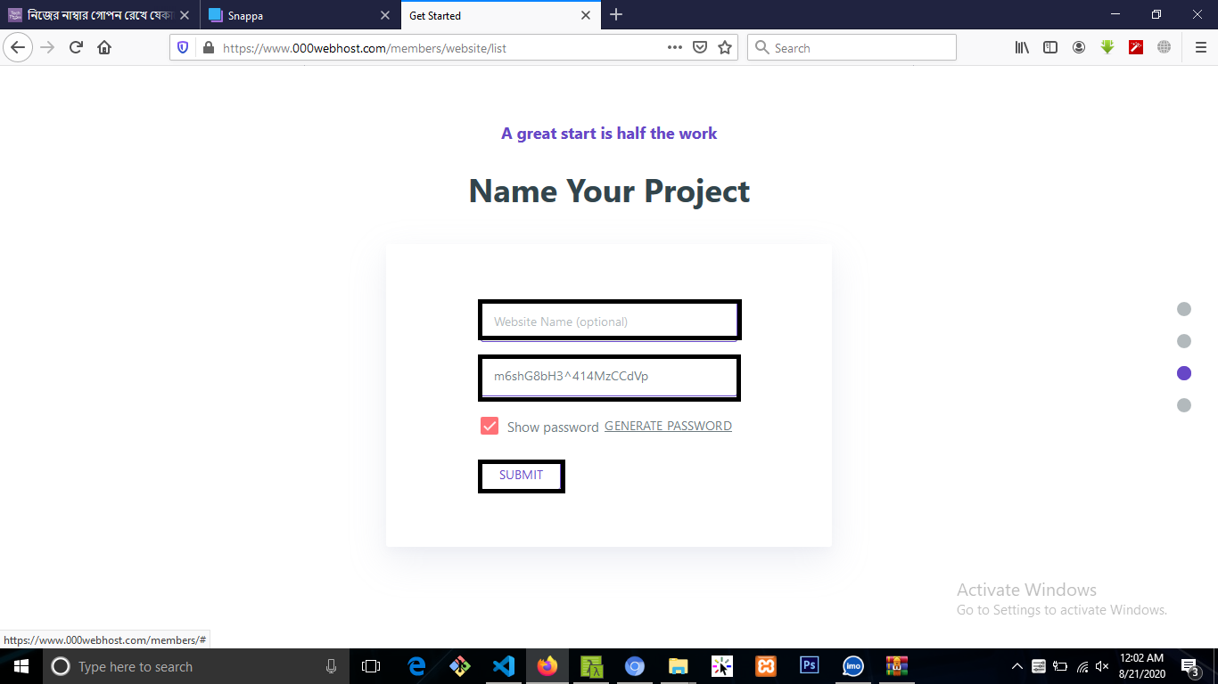 এখানে প্রথম বক্সে আপনার ওয়েব সাইটের একটি নাম চাইবে। আপনি ইচ্ছা মতো একটি নাম দিবেন আর যদি চান নাম দিবেন না তাহলে খালি রাখবেন তারা নিজে থেকে একটি নাম তৈরি করে ফেলবে। এখানে দেওয়া নামটি হবে আপনার ওয়েব সাইটের ডোমেইন। তারপর একটি শক্ত পাসওয়ার্ড দিয়ে SUBMIT বাটনে ক্লিক করুন।