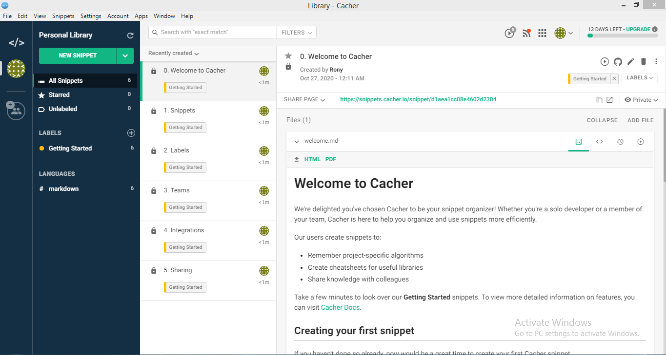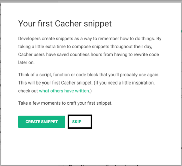 এখানে আপনাকে একটি snippet তৈরি করতে বলতেছে। snippet বলতে আসলে গিটহাবে যাকে gists বলে থাকি এখানে তাকে snippet বলা হয়। আমরা যেহেতু প্রথমে সফটওয়্যারটাকে একটু ঘুরে দেখবো সেজন্য skip বাটনে ক্লিক করবো।