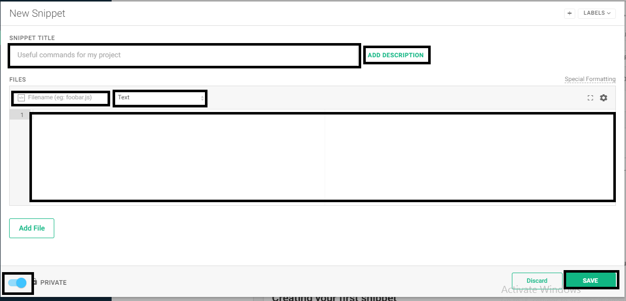 আপনার সামনে উপরের মতো একটি পপআপ অপেন হবে। যার মাধ্যমে আপনি আপনার কাঙ্গিত snippet টি তৈরি করতে পারবেন। এখানে প্রথমে আপনার snippet টির একটি টাইটেল চাচ্ছে, আপনি আপনার মতো করে একটি টাইটেল দিয়ে দিবেন। তার পাশেই একটি বাটন রয়েছে, যেখানে লেখা রয়েছে Add Description। এই বাটনে ক্লিক করলে আপনি আরো একটি টেক্স বক্স দেখতে পাবেন। যেখানে আপনি একটি ডেসক্রিপশন লিখে রাখতে পারেন। তারপরের বক্সে আপনাকে একটি নাম দিতে হবে যা আপনার snippet এর নাম হিবেসে গণ্য হবে। নাম দেওয়ার পর আপনাকে অবশ্যই ডট দিয়ে ফাইলটির এক্সটেনশন দিয়ে দিতে হবে যাতে করে সফটওয়্যারটি বুঝতে পারে এটি কিধরনের কোড বা কোন ল্যাঙ্গুয়েজ এর কোড। তারপর আপনি বড় বক্সটাতে আপনার কোড গুলো লিখে রাখুন।