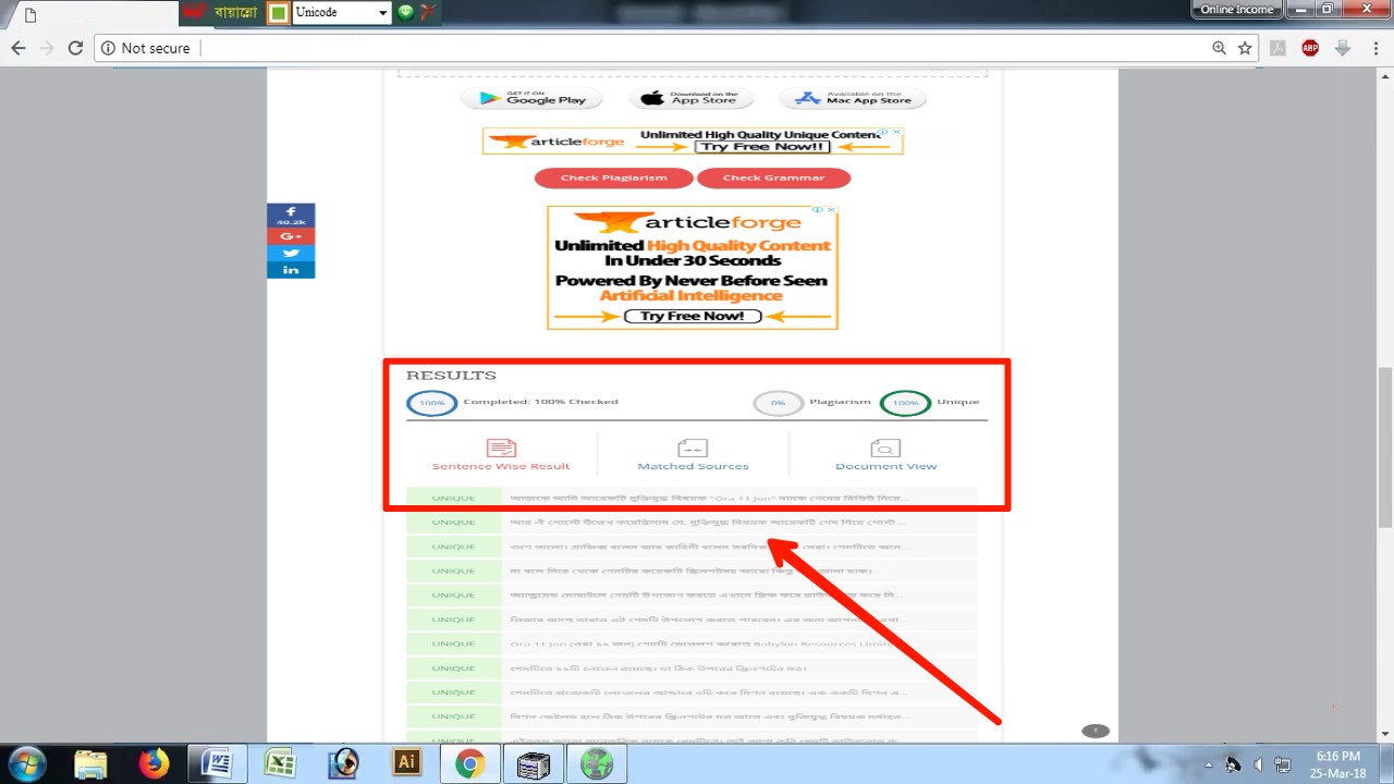 তারপর উপরের স্ক্রিনশটের মত রেজাল্ট দেখতে পারবেন যে, আপনার কন্টেন্ট বা লেখাটি কত পার্সেন্ট ইউনিক বা কপিমুক্ত এবং কত পার্সেন্ট কপিরাইটের আওতায়।