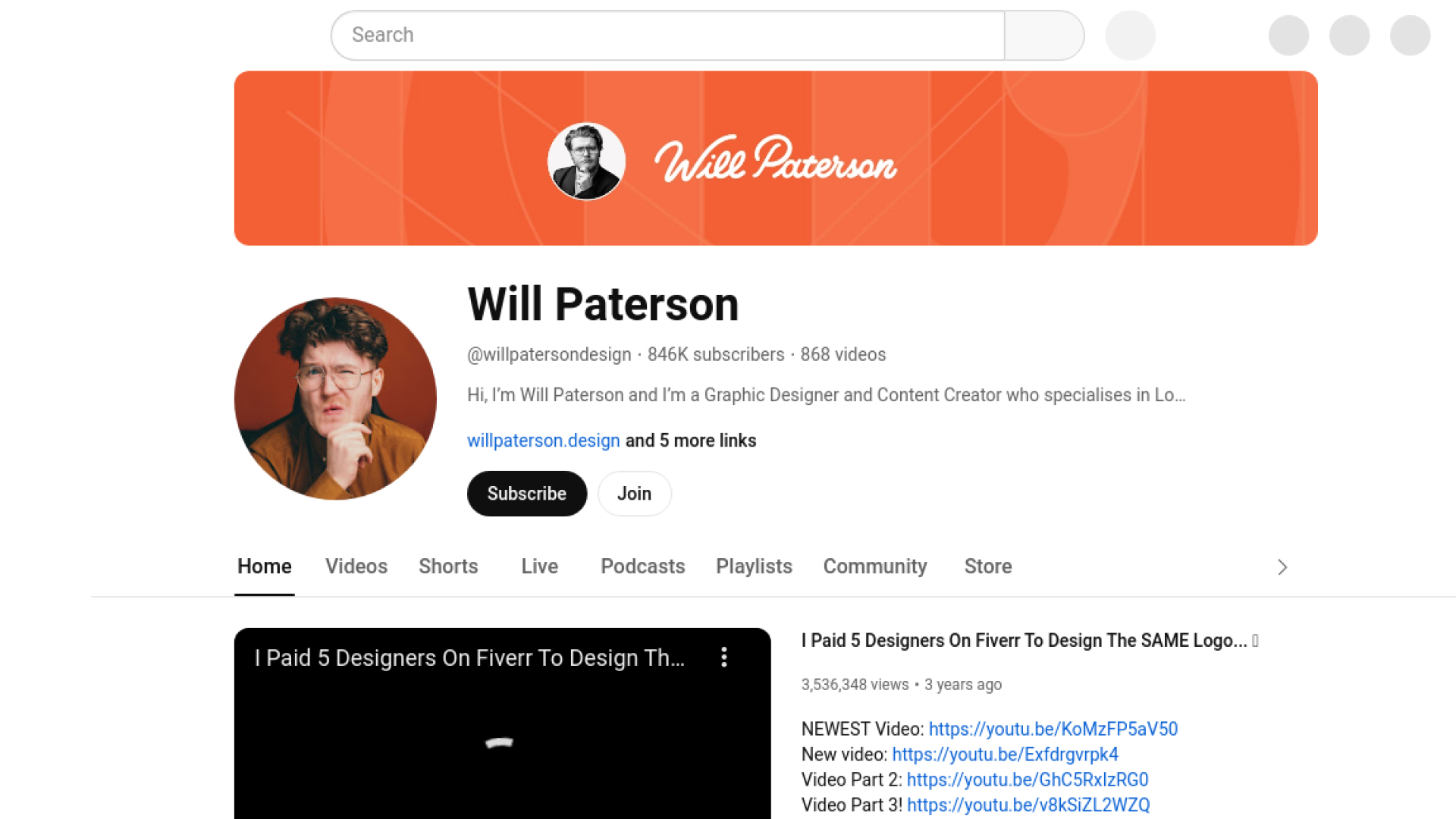 Will Paterson হলেন একজন সফল গ্রাফিক্স ডিজাইনার এবং হ্যান্ড লেটারিং এক্সপার্ট, যার উদ্যোগে তিনি একটি ইউটিউব চ্যানেল তৈরি করেছেন। তার চ্যানেলে মূলত গ্রাফিক্স ডিজাইন, ড্রয়িং, হ্যান্ড লেটারিং, লোগো ডিজাইন ইত্যাদি বিষয়ে ভিডিও পাওয়া যায়। তার সৃজনশীল আকারে দেখানো টিউটরিয়াল ভিডিও গুলোতে থাকে কীভাবে বিভিন্ন ডিজাইন প্রক্রিয়াগুলি কাজগুলো করা হয় এবং নতুন ডিজাইনারদের জন্য উপকারী পরামর্শ তিনি প্রদান করে থাকেন। যাতে তার ভিউয়াস তারপরামর্শ অনুযায়ী ভালো কিছু করতে পারে অথবা জ্ঞান অর্জন করতে পারে।