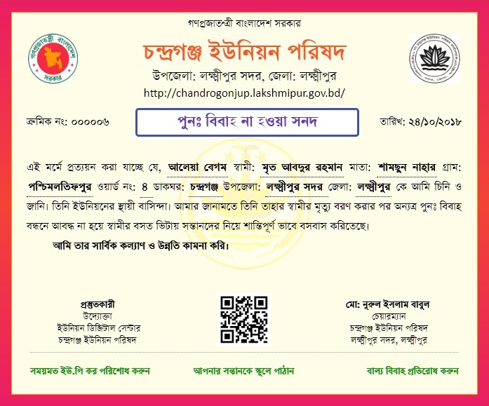 পুঃনবিবাহ না হওয়া সনদ তৈরী