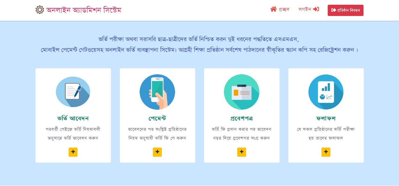 সকল শিক্ষা প্রতিষ্ঠানের ভর্তি কার্যক্রমকে সহজ এবং সময় উপযোগী করতে অনলাইন অ্যাডমিশন সিস্টেম। আগ্রহী শিক্ষা প্রতিষ্ঠান সর্বশেষ পাঠদানের অনুমতির স্ক্যান কপি সহ http://www.admission.exploreeims.com এই ওয়েব সাইটে রেজিষ্ট্রেশন করুন।