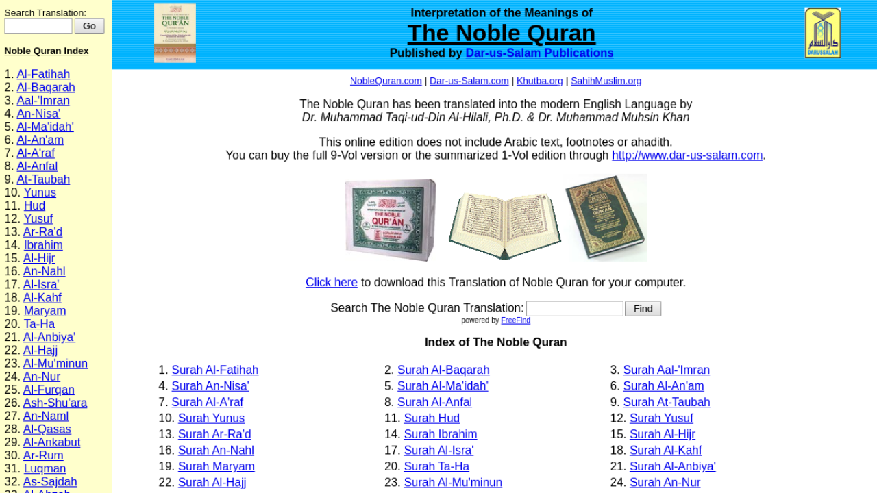 The Noble Quran হচ্ছে ইংরেজিতে কুরআনের অনুবাদ পড়ার জন্য অরেকটি ফ্রি ওয়েব সাইট। আপনি যখন এই ওয়েব সাইটে ভিজিট করবেন, আপনার কাছে সবচেয়ে ভাল লাগবে যে বিষয়টি তা হল ১১৪ টি সূরার কুইক লিঙ্ক খুবই সুন্দর করে সাজানো রয়েছে।