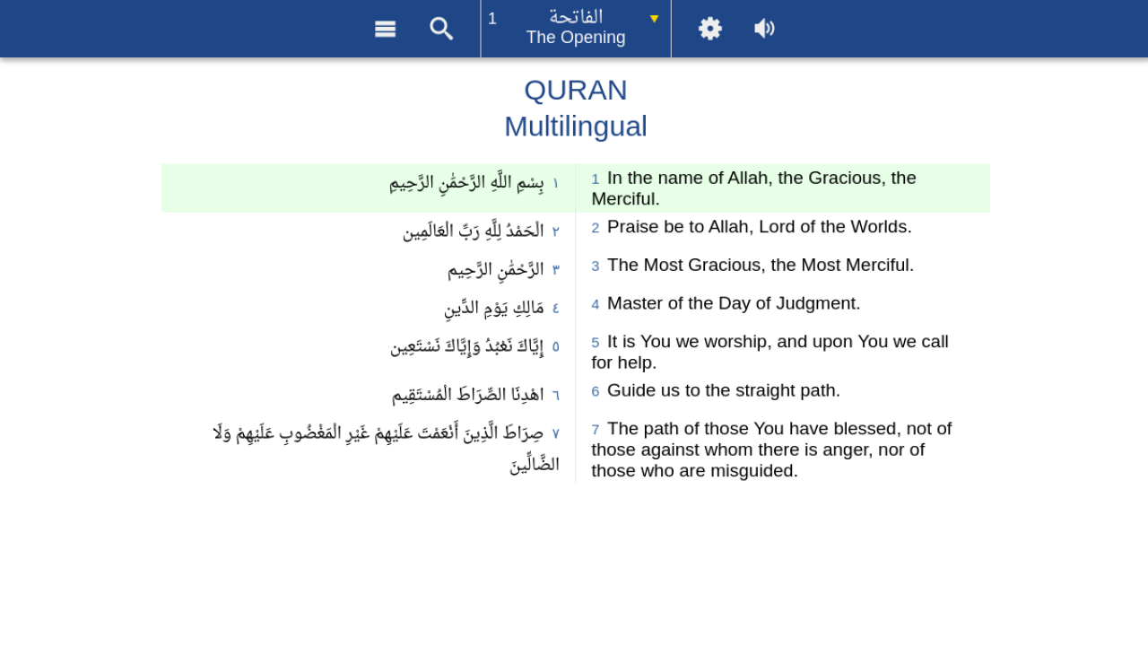 এই ওয়েব সাইটে, আপনি কুরআনের সমস্ত পারা একত্রে পাবেন। তবে ডিফল্ট ভাবে আল-ফাতিহা (সূচনা) সূরা লোড হবে এবং প্রতিটি আয়াত উপর মাউসের রাইট ক্লিক করলেই আপনি কত নাম্বার আয়াত পড়ছেন তা ট্রাক করতে পারবেন। আর এই ওয়েব সাইটে আপনি ডিফল্ট ভাবে আরবী কুরআন এবং ঠিক এর ডান পাশে ইংরেজিতে এর অনুবাদ দেখতে পাবেন।