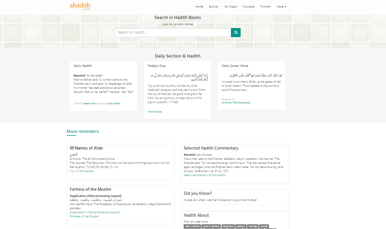 অনলাইনে হাদিস পড়ার দারুণ এক লাইব্রেরি হচ্ছে Ahadith। এখানে আপনি ডেইলি হাদিস, প্রতিদিনের দোয়া, এবং কোর আনের তিলাওয়াত শুনতে পারবেন। মহান আল্লাহ পাকের ৯৯ টি নাম সহ মুসলমানদের বিভিন্ন দিকনির্দেশনা দেয়া আছে ওয়েব সাইটটিতে।