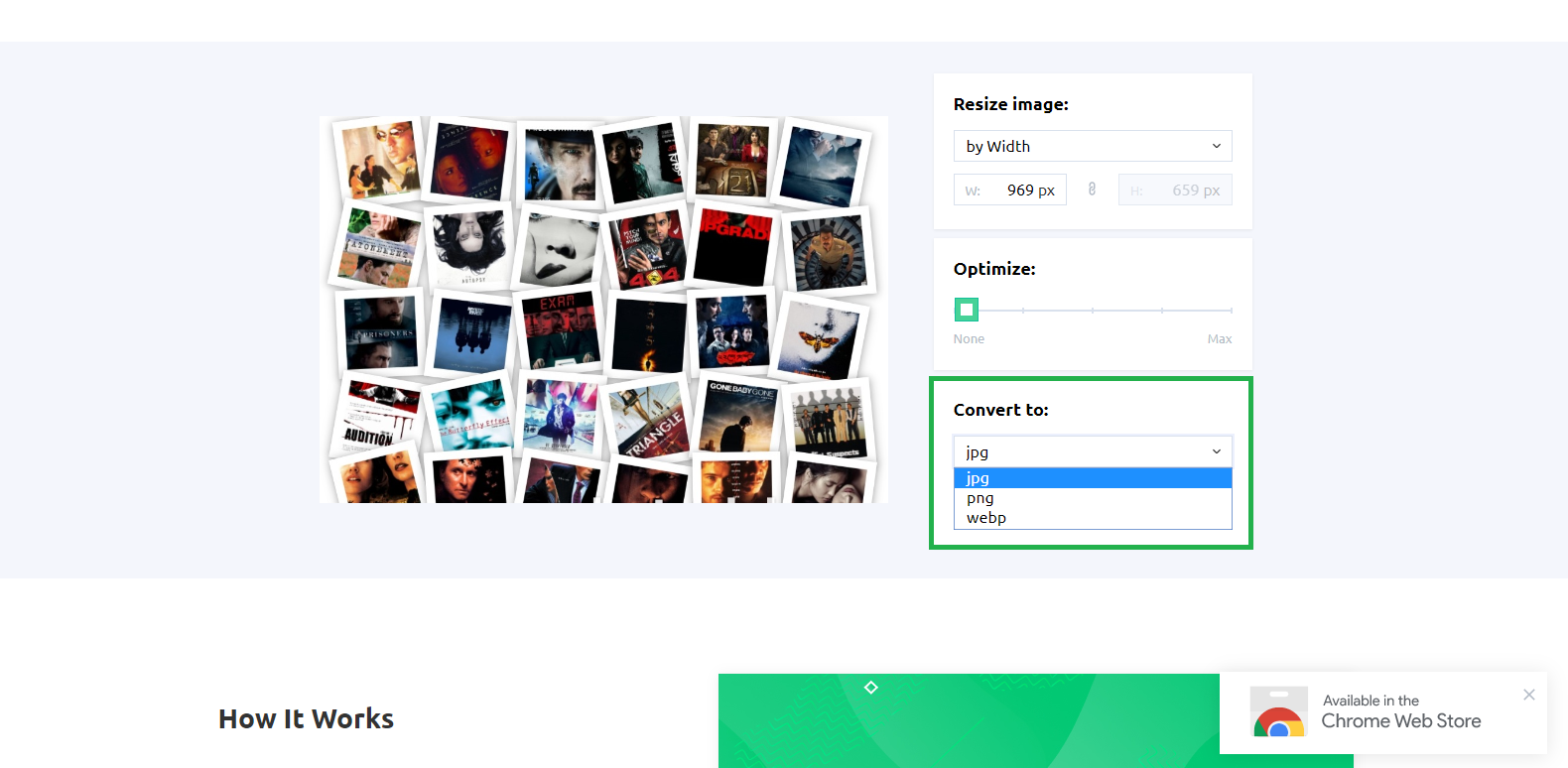 এবার আসি Convert to নিয়ে। আপনি আপনার ছবিকে কোন ফরমেটে সেভ করতে চান এটা নির্ধারন করুন। আপনি বর্তমানে Resizing.app এর মাধ্যমে তিনটি ফরমেটে যেমন jpg, png, এবং webp আপনার ছবি সেভ করতে পারবেন।