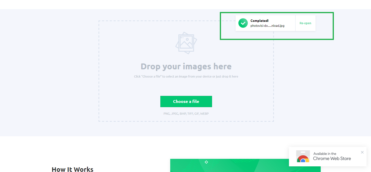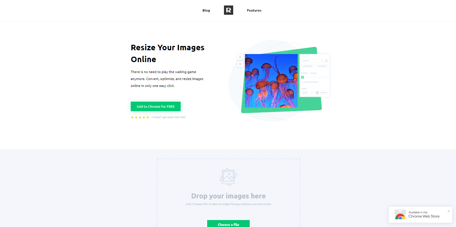 প্রথম Resizing.app ওয়েবসাইটে চলে যান। আমরা হোম পেজে গিয়ে দেখতে পাচ্ছি Drop Your images Here অপশন আছে। খেয়াল করে দেখুন এখানে গুগল ক্রোমের আইকন দেখতে পাচ্ছেন, তারমানে আপনি ক্রোমের এক্সটেনশনের মাধ্যমেও এই টুলটি ব্যবহার করতে পারবেন।