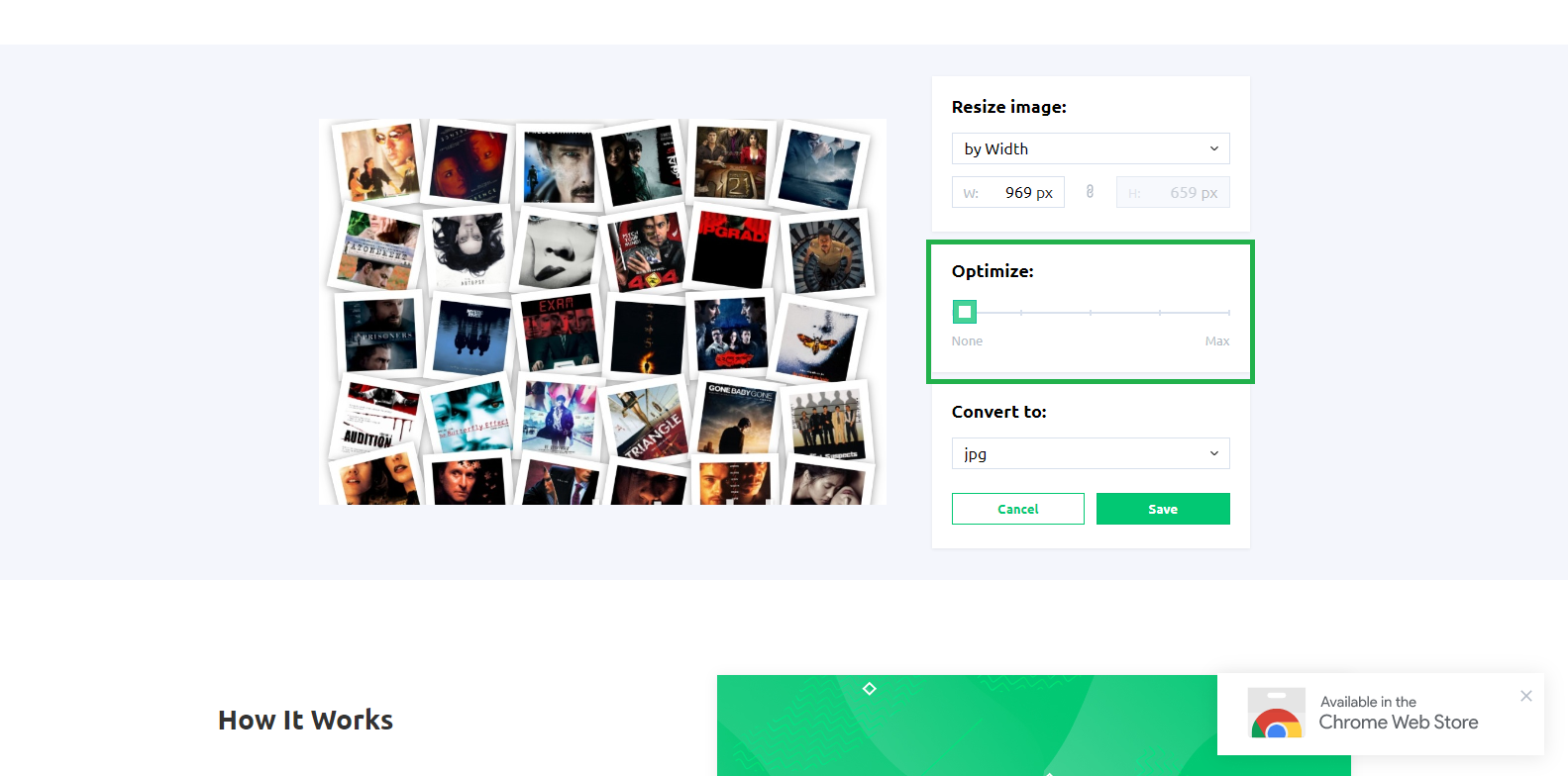 Optimize এর মাধ্যমে আপনি ছবির সাইজ এবং কোয়ালিটি নির্ধারণ করতে পারবেন। Optimize যত বাড়াবেন তত ফটোর সাইজ কমতে থাকবে। তবে বেশি কমাতে গিয়ে ছবির কোয়ালিটি যাতে নষ্ট না হয় সেদিকে খেয়াল রাখতে হবে।