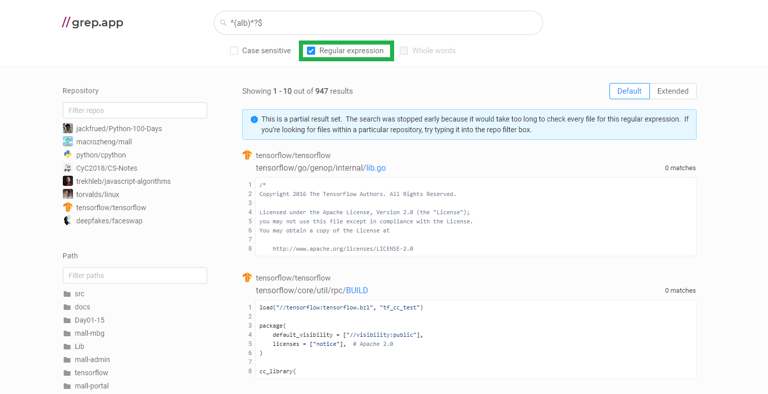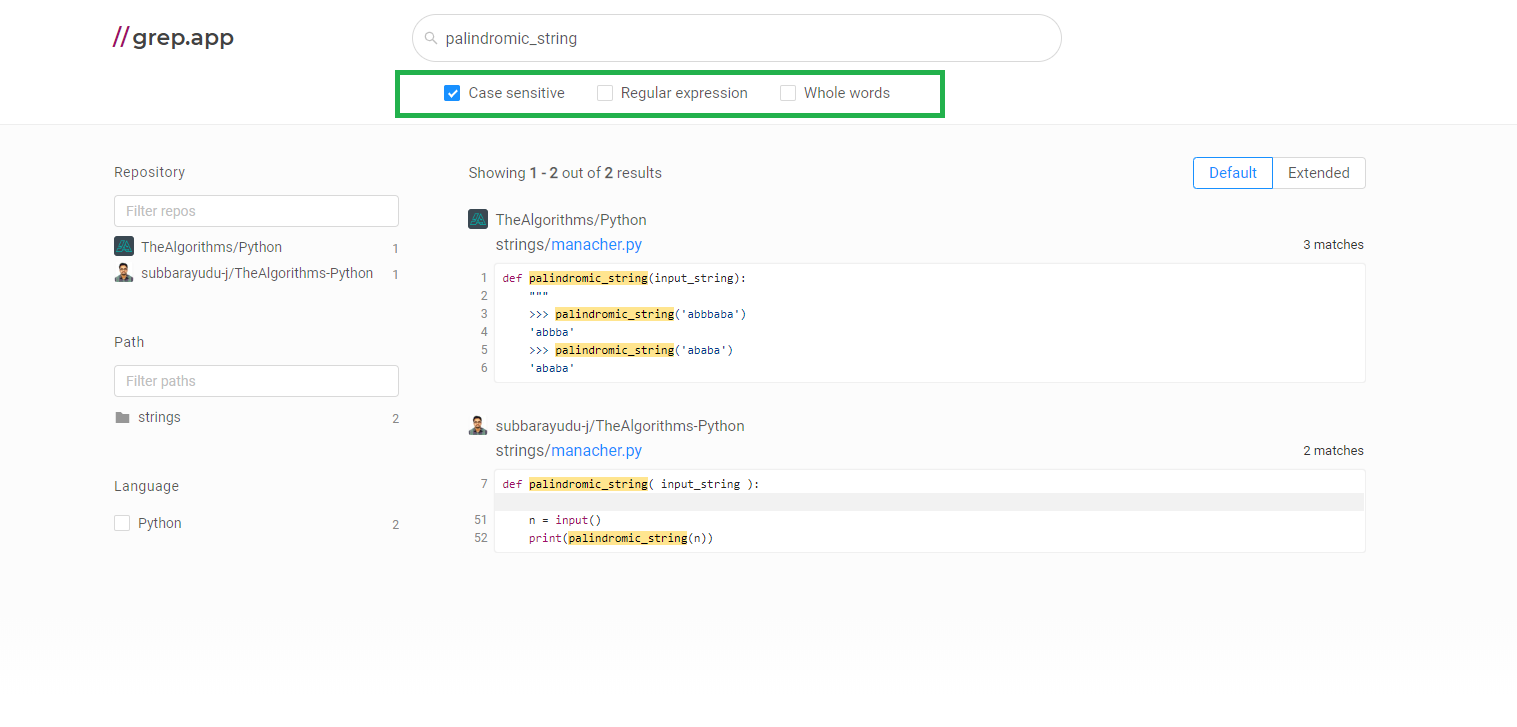 এই grep.app ওয়েব সাইটে আপনি চাইলে তিন ধরনের সার্চ করতে পারবেন যেমন, Case Sensitive, Regular Expression এবং Whole Word।