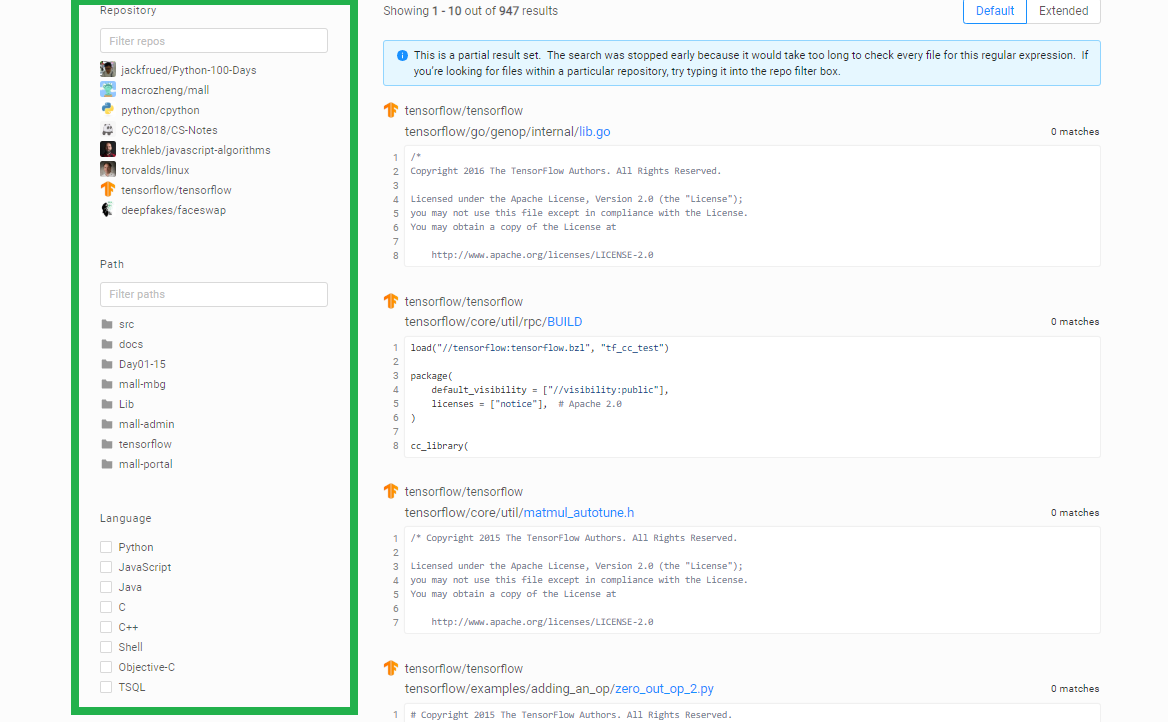এখানে চাইলে আপনি রেজাল্ট গুলো repositories, paths, and programming languages ফিল্টার করেও দেখতে পারেন।