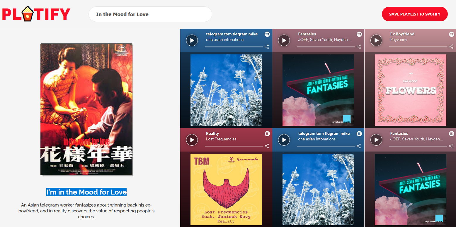আপনি যখন সিনেমার নাম লিখে সার্চ করবেন। সাথে সাথে Plotify মুভির প্লট এবং ক্যাটাগরি IMDB এর মাধ্যমে খুঁজে বের করবে। এবং কি-ওয়ার্ড তৈরি করবে, সেই কি-ওয়ার্ড গুলো Spotify এ সার্চ দিয়ে আপনার জন্য প্লে লিস্ট তৈরি করবে।