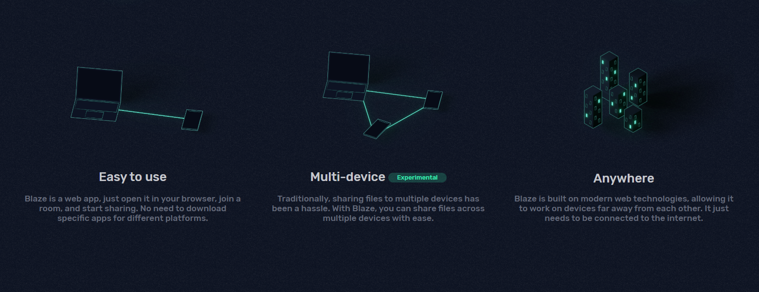Blaze এর ওয়েবসাইটে ঢুকে আপনি ফাইল শেয়ারিং করার জন্য আলাদা একটি রুম তৈরি করবেন। আপনিও অন্য কারো রুমে ঢুকতে পারবেন এবং সেখানে ফাইল আদান-প্রদান করতে পারবেন। এই সার্ভিসটি কয়েকটি ডিভাইসে যেমন, কম্পিউটার, স্মার্ট-ফোন, টেবলেট কম্পিউটারে সাপোর্ট করে। দ্রুত তথ্য আদান-প্রদান করার জন্য এই সার্ভিস ডেভেলপাররা ফোনে এবং কম্পিউটারেও সেট করেছে।