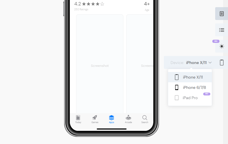 আপনি Preview প্যানে App Store এর ল্যা-আউট চেঞ্জ করতে পারবেন। ফ্রি ইউজার হিসাবে দেখতে পারবেন iPhoneX/11 অথবা iPhone 7/8 ডিভাইসে কেমন দেখাবে আপনার অ্যাপটি। Pro ভার্সনে iPad সহ ডার্ক মুডে Preview দেখতে পারবেন।