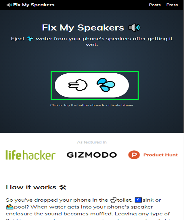 Fix My Speakers একটি ফ্রি ওয়েব অ্যাপলিকেশন বা অনলাইন টুল যা আপনার ফোনের স্পিকার থেকে পানি বের করতে সাহায্য করবে। এই ওয়েবসাইট অডিও প্লে করার মাধ্যমে ফোনের স্পিকার থেকে পানি বের করার কাজ করবে। এই ওয়েবঅ্যাপটি মূলত হাই Pitch এর সাউন্ড প্লে করবে যা স্পীকারে থাকা পানিকে বের হয়ে যেতে বাধ্য করবে। এটি প্রায় সকল ফোনের ক্ষেত্রেই কাজ করে, আপনি সাউন্ড প্লে করে দিন বাকি কাজ Fix My Speakers করে দেবে।