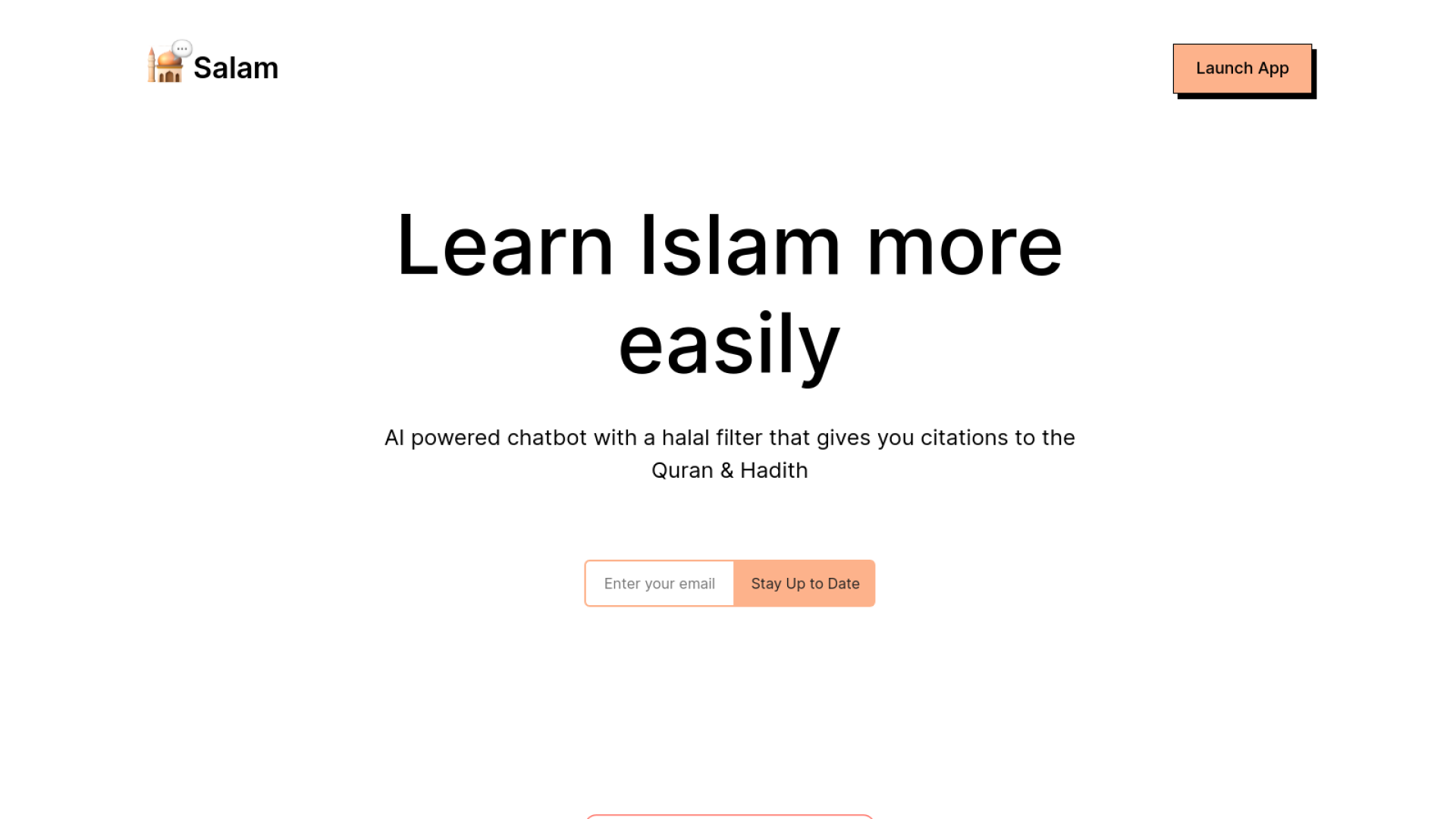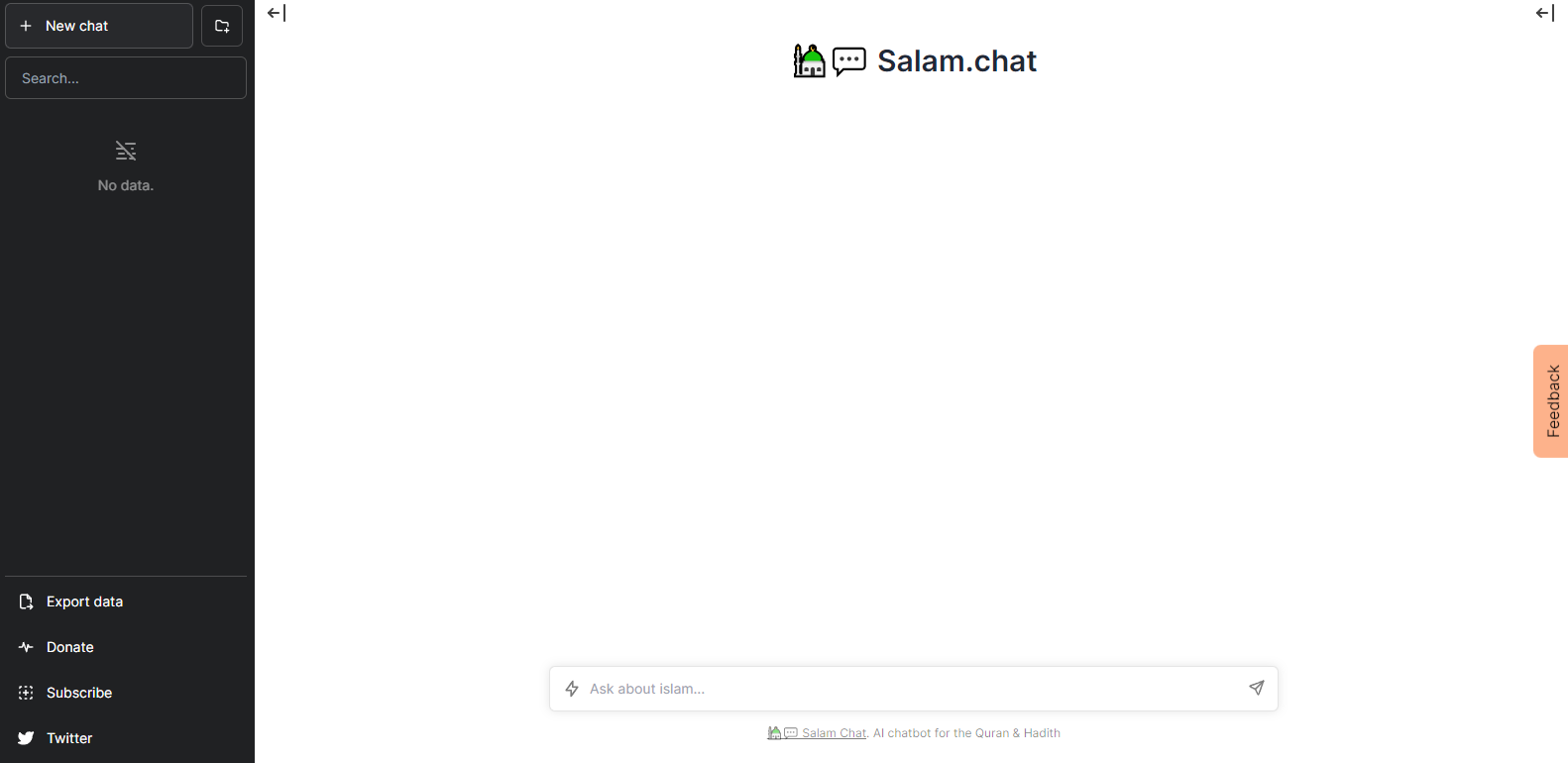 Salam.chat একটি আর্টিফিশিয়াল ইন্টেলিজেন্স ভিত্তিক চ্যাটবট যার মাধ্যমে আপনি ইসলাম সম্পর্কে জানতে পারবেন এবং পবিত্র কোরআন ও হাদিস নিয়ে ব্যাখ্যা পাবেন। একই সাথে লোকেশন অনুযায়ী নামাযের টাইমও দেখতে পারবেন।