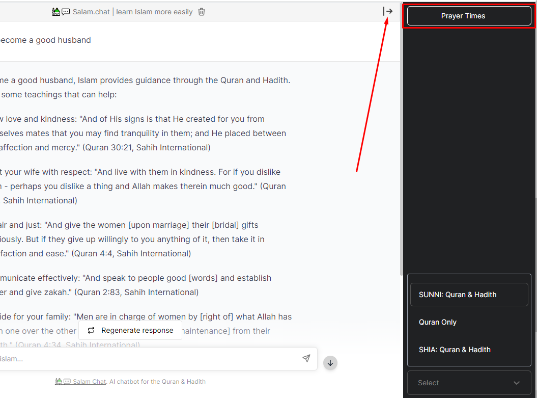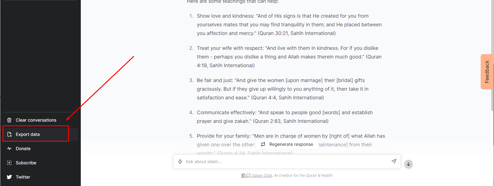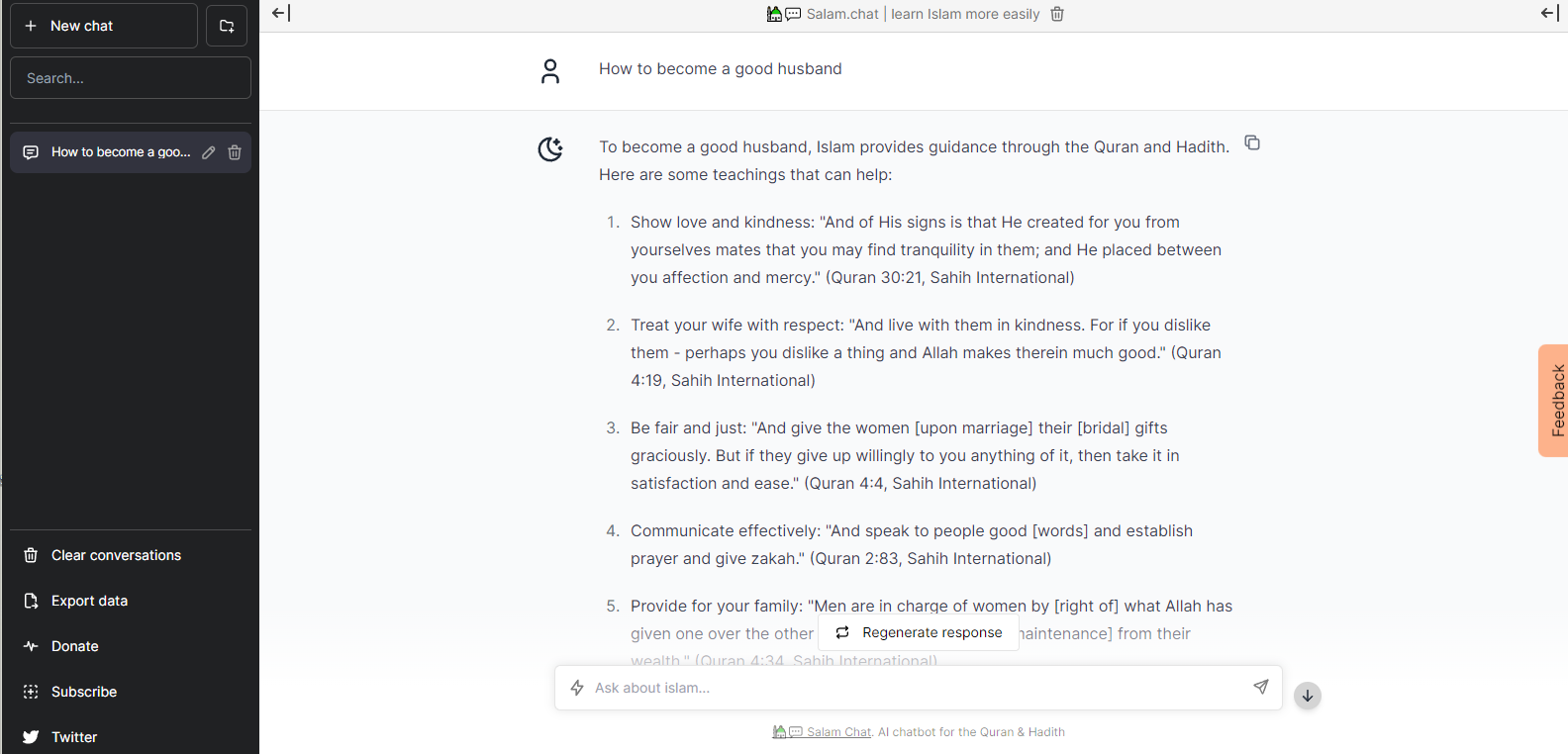 Salam.chat এ কোন প্রশ্ন জানতে চাইলে এটি পবিত্র কোরআন ও হাদিসের আলোকে আপনাকে উত্তর দেবার চেষ্টা করবে। আপনি চাইলে Salam.chat এর রেসপন্স গুলো JSON ফরমেটে এক্সপোর্টও করতে পারবেন।