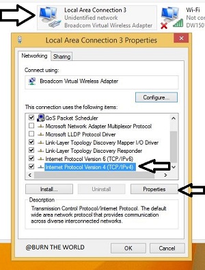 ক্লিক Start বাটন,তারপর Control Panel,Network and Sharing Center | এখন আপনার WI-FI এডাপটর এর আইকন এ রাইট ক্লিক করে properties এ ক্লিক করুন, নতুন একটি পপ-আপ উইন্ডো অপেন হবে।