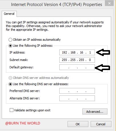 এখন GENERAL টেব এ ক্লিক করুন। তারপর “Use the following IP address" সিলেক্ট করুন এবং IP Address field এ টাইপ করুন "192.168.16.1" পরের ভেলু অটো ফিলাপ হবে। তারপর নিচে Subnet Mask field এর Default Gateway field এ টাইপ করুন "192.168.0.1" এবং ok দিয়ে বের হয়ে আসুন।