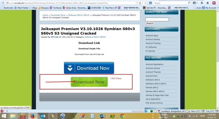 আপনার নোকিয়া S60v3 / V5 মোবাইল কে HotSpot করতে Joiku hotspot software টি ডাউনলোড করে নিন। প্রয়োজনে google এর সাহায্য নিন অথবা এই লিঙ্কে গিয়া http://www.mrcrab.net/download/4526/Joikuspot_Premium_V3.10.1026_Symbian_S60v3_S60v5_S3_Unsigned_Cracked.html ডাউনলোড করে নিন।এটা ব্যবহার করতে হলে ফোন হ্যক করা থাকতে হতে পারে। লিঙ্কে গিয়া নিচের ছবির মত পেজ আসবে এর সবুজ রঙের "Download Now" Button -এ ক্লিক করলেই ডাউনলোড শুরু হয়ে যাবে। নিচের ছবির মত। আমি অনেকদিন ধরেই এভাবে নেট ইউজ করে আসছি, আর এতে Regular Modem এর চাইতে স্পিড থাকে বেশি। চেষ্টা করে দেখতে পারেন। কোন ভূল থাকলে টিউমেন্টস করে জানাবেন। আর ১টা সমস্যা, এই টিউন টা গতকাল থেকে পাবলিশ করার চেষ্টা করছি, কিন্তু বারবার "টিউনের বিষয়বস্তু খুব অল্প (টিউনের বিষয়বস্তু কমপক্ষে 200 শব্দের হতে হবে, টিউনটিতে আছে 185 টি) " লিখা আসে। কেউ এর সমাধান দিলে খুশি হব।