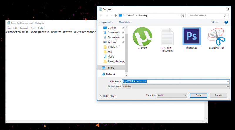 সবকিছু সঠিকভাবে লেখা হয়ে গেলে আপনি উপরে " File " অপশনটি থেকে " Save As " সিলেক্ট করে পরের সেভ উইন্ডো থেকে Text File এর জায়গায় All Files সিলেক্ট করুন এবং ফাইলের নাম দিন " My Wifi Password.bat " এবং ফাইলটি সেভ করুন। নিচের চিত্রটি লক্ষ্য করুন।
