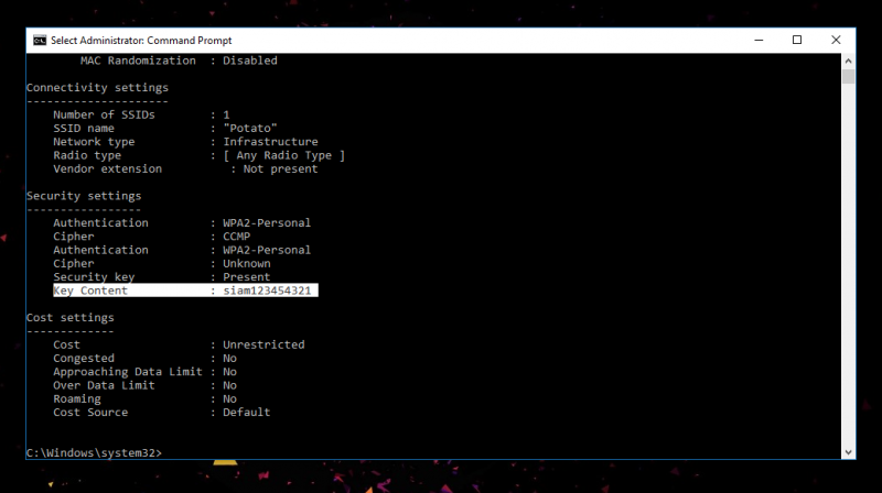 যে ফাইলটি সেভ করলেন আপনি, এবার সেই ফাইলটির উপরে ডাবল ক্লিক করে ফাইলটি ওপেন করবেন। তাহলে আপনি দেখবেন যে একটি কমান্ড প্রম্পট ওপেন হবে এবং এই কমান্ড প্রম্পট উইন্ডোতেই আপনি আপনার ওয়াইফাই এর পাসওয়ার্ড পাবেন। নিচের ছবিটি লক্ষ্য করুন। ঠিক কোথায় আপনি পাসওয়ার্ডটি পাবেন তা সাদা রং দিয়ে মার্ক করা আছে।