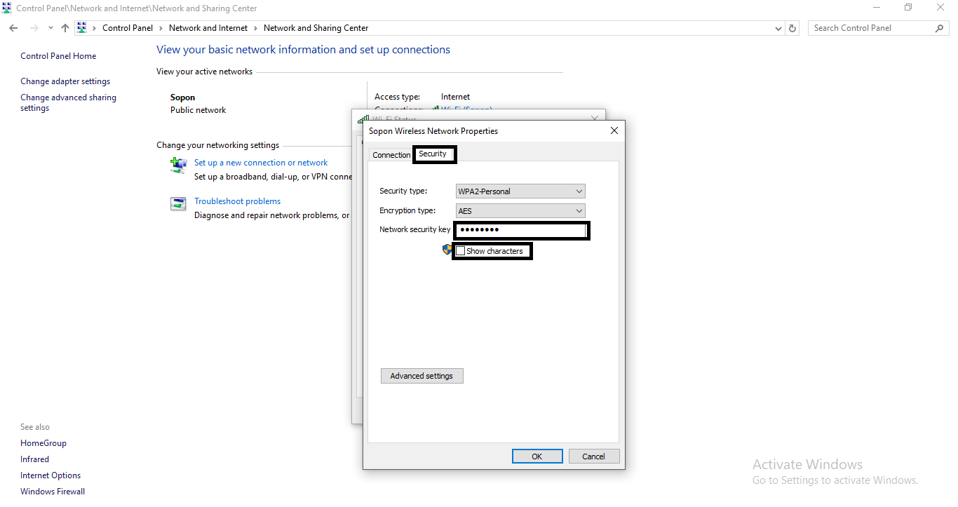এখান থেকে Security ট্যাবে যাবেন। এবং নিচে দেখতে পাবেন একটি Show Character নামে চেকবক্স রয়েছে। সেখানে চেক দিয়ে দিবেন। তাহলে আপনি Network Security key অপশনে আপনার ওয়াই ফাই এর কাঙ্গিত পাসওয়ার্ডটি দেখতে পাবেন। আর সহজেই সেই পাসওয়ার্ড দিয়ে যেকোন ডিভাইসে কানেক্ট করতে পারবেন।