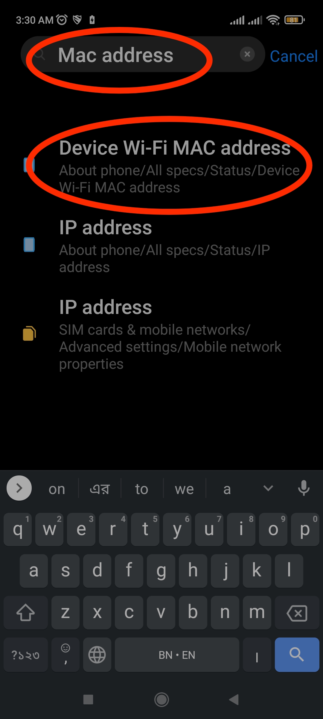 এরপর নীচে অথবা উপড়ে একটু খুঁজাখুঁজি করলেই আপনার ফোনের ম্যাক এড্রেস টি দেখতে পাবেন।
