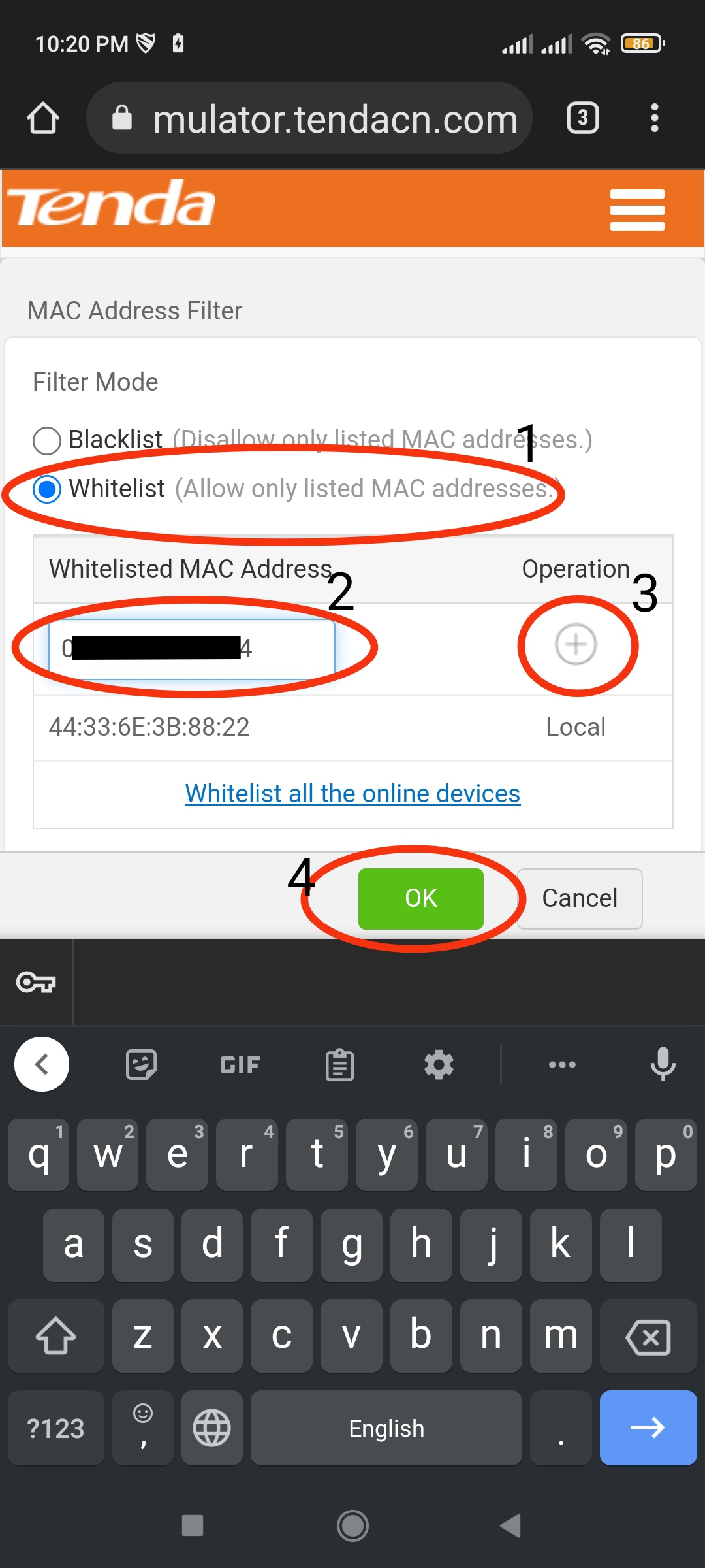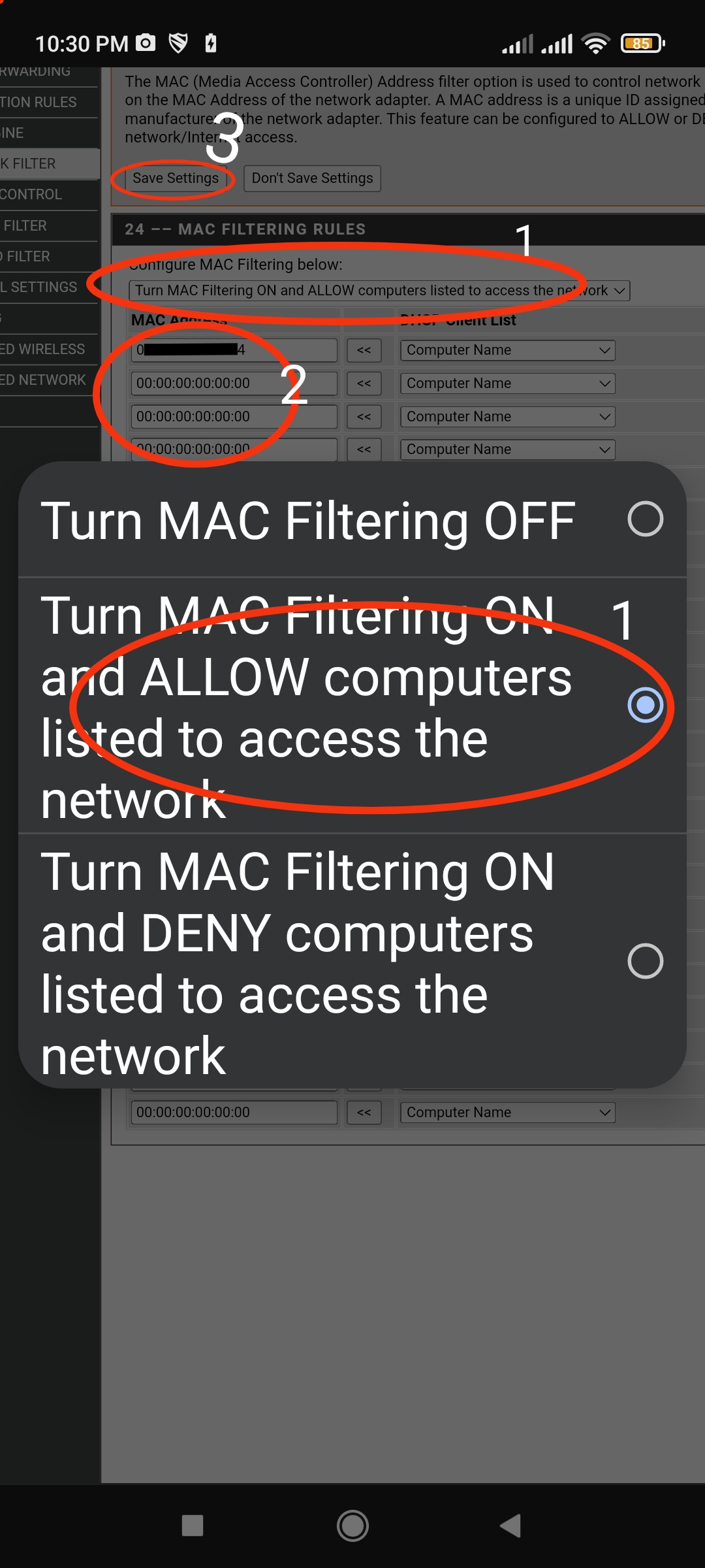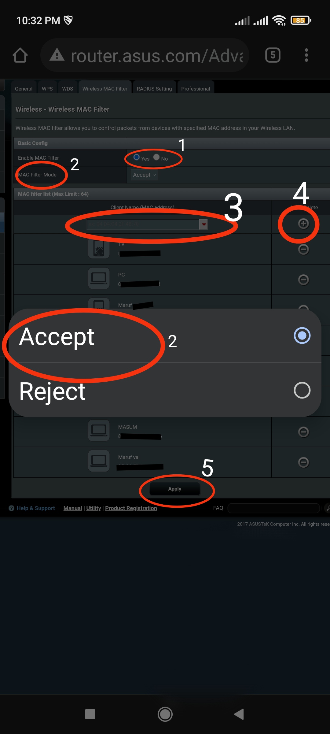 উপরের অপশন গুলোতে লক্ষ করলে দেখতে পাবেন Wireless Mac Filter অপশন টি রয়েছে। সেটিতে ক্লিক করুন। এরপর নিচের দেখানো ছবি ও বুলেট নাম্বার অনুযায়ী প্রত্যেকটি স্টেপ ভালোমতো খেয়াল করুন। মনে রাখবেন, সমস্ত স্টেপ ভালোমত Complete করার আগে ভুলেও Apply বাটনে ক্লিক করবেন না। এতে আপনার রাউটারের ক্ষতি হতে পারে।
