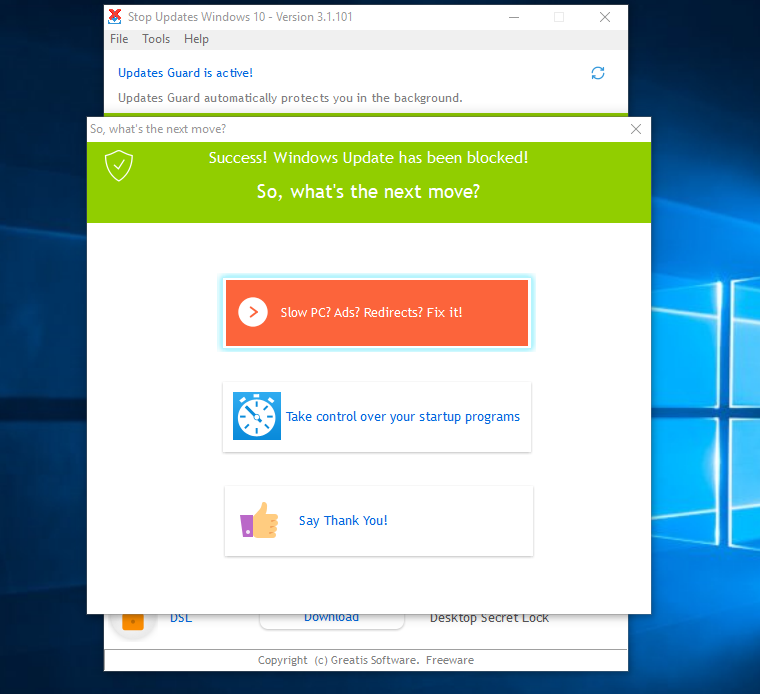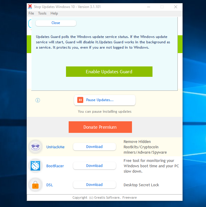 Updates Guard হচ্ছে stopupdates10 এর একটি সিস্টেম সার্ভিস যা আপনার সিস্টেম এর ব্যাকগ্রাউন্ডে কাজ করে আপনার সিস্টেম এর আপডেট বন্ধ করে দেয়। এটা আপনার Windows update service বন্ধ করার জন্য একটি এক্টিভিটি ক্রিয়েট করে। ফলে Updates Guard যদি Windows Update service (Wuauserv) কখন স্টার্ট হয় তা ডিটেক্ট করতে পারে তাহলে সাথে সাথে ডিজেবল করে দিবে। আর এই সার্ভিসটি ডিফল্ট ভাবে ৫ সেকেন্ড পর পর উইন্ডোজ এর কোন আপডেট সার্ভিস একটিভ আছে কিনা চেক করে, যদি একটিভ পায় তাহলে সাথে সাথে ডিজেবল করে দেয়। আর stopupdates10.ini কাস্টমাইজ করে আপনি ইচ্ছা করলে ৫ সেকেন্ড কে বাড়াতে বা কমাতে পারবেন। এছাড়াও আপনার সিস্টেম অন হওয়ার সাথে সাথে Updates Guard অটোমেটিক্যালি স্টার্ট হবে। আর এই কারণে এটি আপনার র্যাম ও রম থেকে কিছুটা স্পেস ব্যবহার করবে। ফলে আপনাকে আর কষ্ট করে StopUpdates10 সফটওয়্যারটি ওপেন করতে হবে না। আর যেকোন ধরনের আপডেট থেকে Updates Guard আপনার সিস্টেম কে অটোমেটিক্যালি প্রোটেক্ট করে ফেলবে।