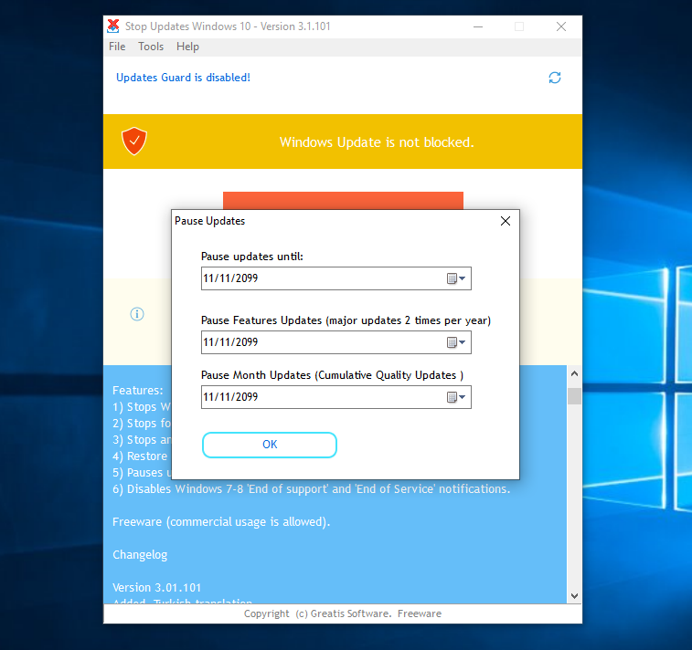 এবার আপনাদের কে দেখাবো কিভাবে Windows এর অটোমেটিক আপডেট বন্ধ করবো StopUpdates10 এর "suspended update" ব্যবহার করার মাধ্যমে। আপনারা সবাই জানেন যে, Windows 10 এ ডিফল্ট ভাবে নির্দিষ্ট সময়ের জন্য অটোমেটিক আপডেট পজ করতে পারবেন। কিন্তু StopUpdates10 ব্যবহার করে এক যুগ পর্যন্ত পজ করে রাখতে পারবেন। এছাড়াও আপনি দুইটি আলাদা অপশনে "Feature Update" এবং "Month Update" আপডেট পজ করতে পারবেন সহজেই।