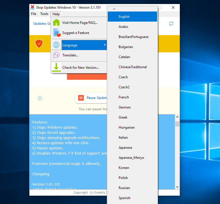 StopUpdates10 ইন্সটল করার পরে যদি আপনি ইংরেজি ভাষার বদলে অন্য কোন ভাষা দেখেন এবং কোথা থেকে কি করবেন না বুঝে থাকেন তাহলে উপরেরভ Help মেনু থেকে "Language" সিলেক্ট করে সফটওয়্যার এর ভাষা ইংরেজি করে নিন। ভালো ভাবে বুঝতে নিচের ছবিটা দেখুন।
