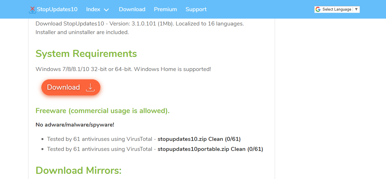 প্রথমে StopUpdates10 এর অফিসিয়াল ওয়েবসাইটে যান, ডাউনলোড করতে স্ক্রল করে নিচের দিকে যান বা উপরের ডাউনলোড মেনুতে ক্লিক করে সেখান থেকেও এই টুলস ডাউনলোড করতে পারবেন, এই টুলস'টি আপনি পোর্টেবল ভার্সন ডাউনলোড করতে পারবেন একদম ফ্রিতেই। আর আপনি যদি সফটওয়্যার ইন্সটল করার ঝামেলায় না যেতে চান তাহলে পোর্টেবল ভার্সন ব্যবহার করতে পারবেন কোন রকম ইন্সটলেশন ঝামেলা ছাড়াই।