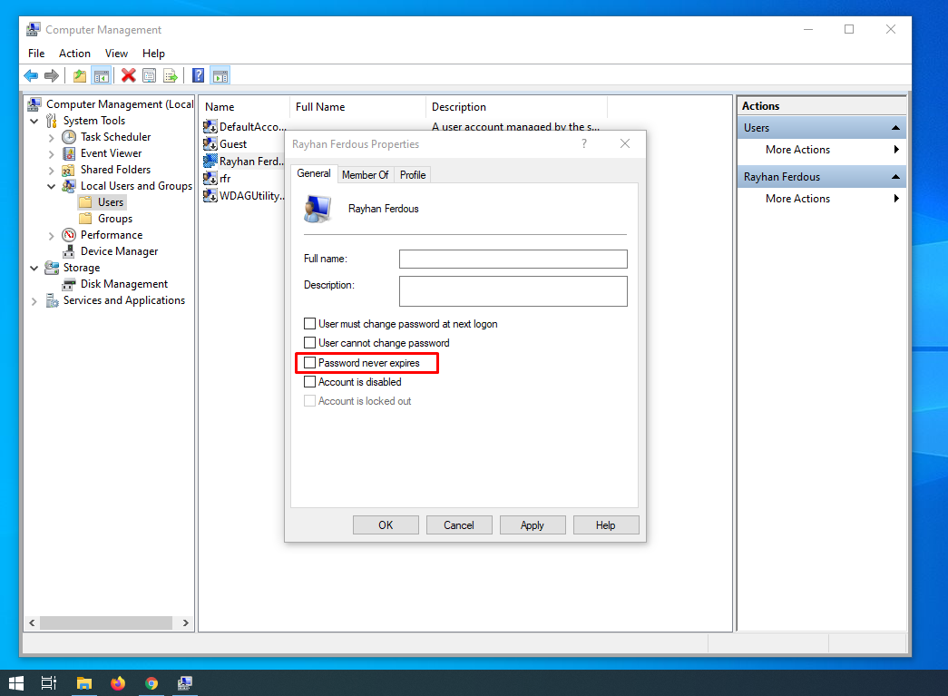 এখন, সিমপ্লি “Password never expires” এর চেকবক্সটি আনচেক করে দিন এবং বাটনে ক্লিক করুন। আর এই মাধ্যমেই এখন থেকে আপনার উইন্ডোজ ১০ এর পাসওয়ার্ড expire সমস্যা থেকে রেহাই পাবেন।