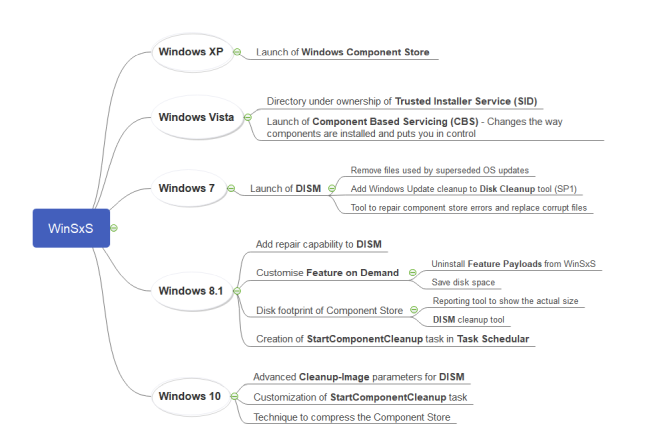 নিচের টাইমলাইন থেকে Windows XP থেকে শুরু করে Windows 10 পর্যন্ত WinSxS ফোল্ডারের ইম্প্রুভমেন্ট দেখানো হল।