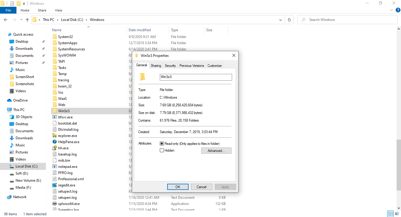 এখন C:\Windows\WinSxS এ নেভিগেট করুন, WinSxS ফোল্ডারের উপর রাইট ক্লিক করুন এবং Properties অপশনটি সিলেক্ট করুন। তাহলে এই ফোল্ডারটি কত জায়গা দখল করে আছে তা দেখতে পারবেন, আমার সিস্টেমে প্রায় ৮ জিবির মত হার্ড ডিস্কের জায়গা ব্যবহার করেছে। তবে আসল কথা হচ্ছে এটি আসল সাইজ না। আর এর কারণ হচ্ছে "hard links" গুলোকে File Explorer এবং অন্যান্য থার্ড পার্টি টুলস গুলো রিড করতে পারে না।