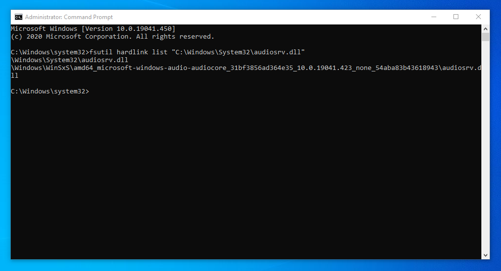 fsutil hardlink list "C:\Windows\System32\audiosrv.dll"