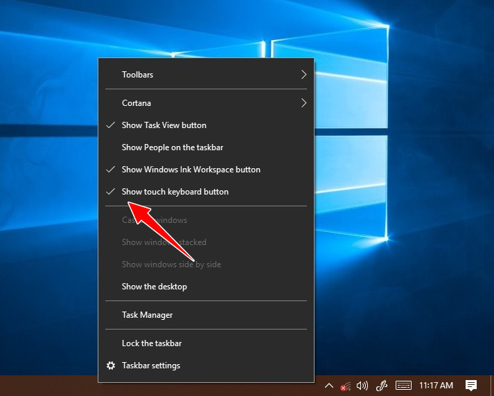 তাছাড়া আপনি যদি উইন্ডোজ ১০ ব্যবহারকারী হোন, তাহলে “Touch Keyboard ” নামে আরেকটি ফিচার পাবেন। যেটা আসলে অনেকটা উপরের অন-স্ক্রীন-কীবোর্ডের মতোই। টাস্কবারে রাইট ক্লিক করে “Show touch keyboard button” অপশনটি এনাবল করে দিন।