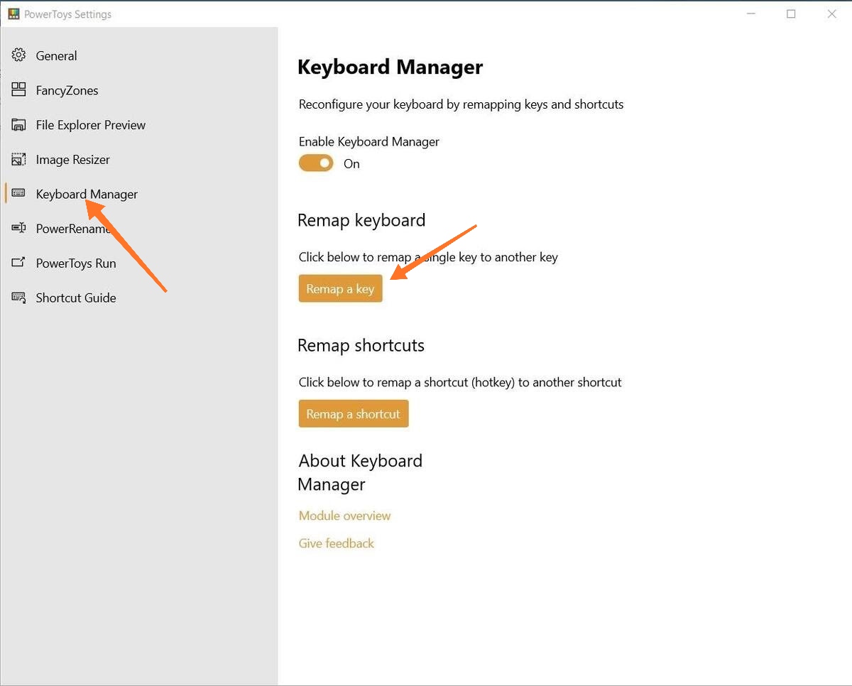 ওপেন করার পর বামপাশের সাইডবার থেকে “Keyboard Manager ” এ ক্লিক করে “Reamap a Key” তে ক্লিক করুন। (এই কাজটি করার জন্য অবশ্যই আপনার উইন্ডোজ ভার্সন 1903 এর উপরে হতে হবে)।