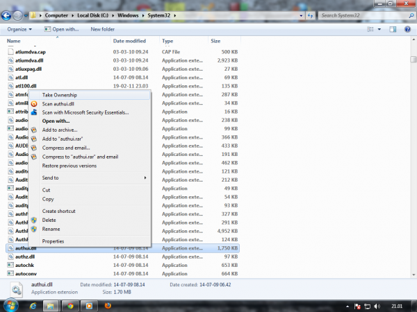 এখন System32 ফোল্ডার এর ভেতর এ authui.dll ফাইলটি খুজে বের করুন এবং ফাইলটির উপর right click করে Take ownership এ ক্লিক করুন.. নিচের ছবির মতো করে...