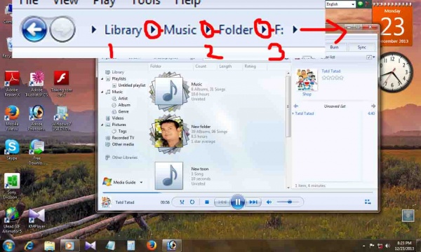 3 এখন যে কাজটি করব তা ছবি বসানোর ধাপ নয় এটা হচ্ছে আপনি যে গানটিতে ছবি সেট করতে চান সেটা ব্রাউজের মাধ্যমে ওপেন করার পদ্ধতি। প্রথমে আপনি ঠিক করুন কোন গানটিতে সেট করবেন এবার যে কোন একটি ড্রাইবে একটি ফোল্ডারে সংরক্ষন করুন এবার নিচের চিত্রের মত আপনার গানটি বের করুন যেমন প্রথমে Library তে গিয়ে Music সেট করুন তারপর মিউজিকের ডানের এরোটি ক্লিক করুন সেখানে Folder সিলেক্ট করুন তারপর যে ড্রাইভে গানটি রাখছেন সেই ড্রাইভ লেটারটি দেখান। নিচে দেখেন আপনার ফোল্ডারটি আছে কিনা তার উপর ডাবল ক্লিক করুন এবার আপনার পছন্দের গানটির উপর ডাবল ক্লিক করুন।
