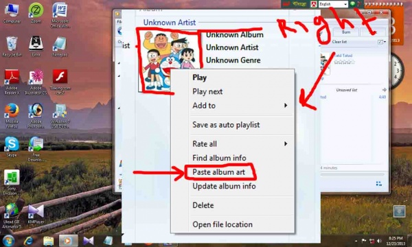 4 এবার মনে আছে আপনি যে আপনার ছবিটি কপি করেছেন এবার আপনার পছন্দের গানটির উপর মাউস রেখে ডান বাটন ক্লিক করুন Paste album art এ ক্লিক করুন ব্যাস ছবি পরিবর্তন হয়ে যাবে এবার যে খানে আপনি গানটি রেখেছেন সেখানে গিয়ে গানটি চালু করুন আপনার ছবিটি মিডিয়া প্লেয়ারে সো করবে। ছবিটি মিডিয়া প্লেয়ারে সামনে আনার জন্য এই কাজটি করে নিন। মিডিয়াপ্লেয়ারের উপর ডান বাটন ক্লিক করুন Visualizations থেকে Album art সিলেক্ট করে দিন আপনার ছবি মিডিয়া প্লেয়ারে বড় করে দেখতে পাবেন।
