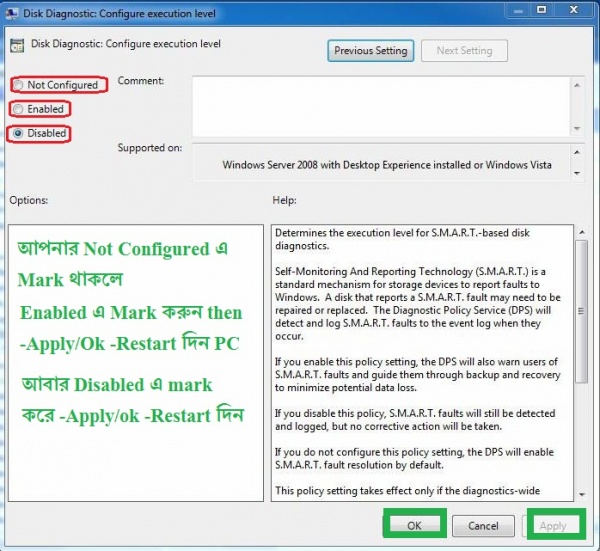 Not Configured এ mark করা থাকলে Enabled এ মারক করুন তারপর Apply দিয়ে PC রিস্টার্ট দিন। আবার এই অবস্থানে ফিরে আসুন এবং Disabled এ ক্লিক করে Apply দিয়ে PC রিস্টার্ট দিন।