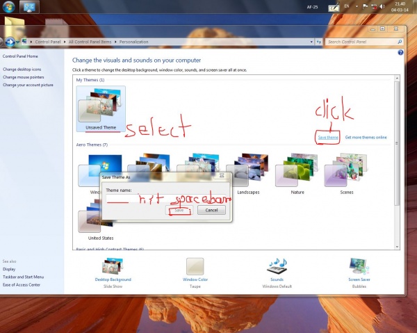 ৯।থিমটির উপরে রাইট ক্লিক করে Save theme এ ক্লিক করুন।নাম চাইলে একবার spacebar চাপুন [আপনি চাইলে অন্য নামও দিতে পারেন] তারপর save এ ক্লিক করুন।