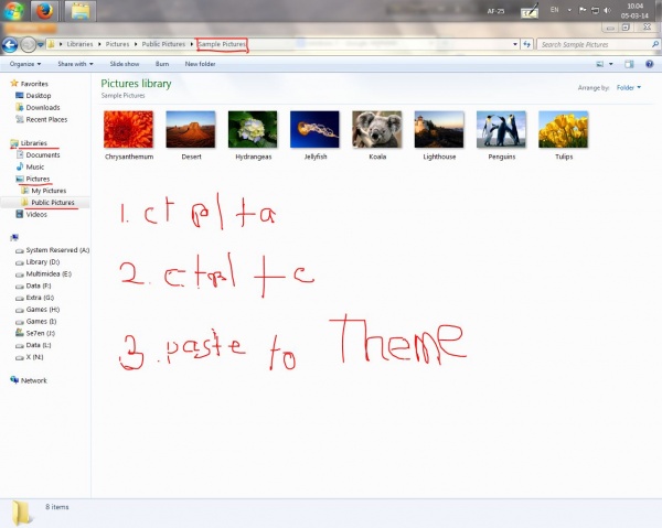 ৫।এখন Libraries\Pictures\Public pictures\Sample pictures এ গিয়ে সকল ফাইল আপনার তৈরি Theme ফোল্ডার এ কপি করুন।