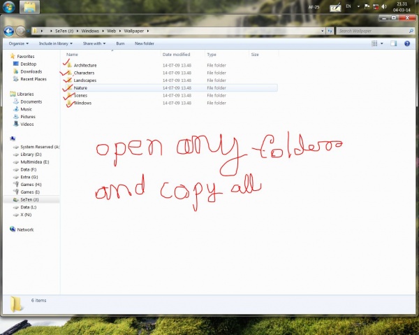 ৩। এখন C:\Windows\Web\Wallpapers এই ডিরেক্টরিতে যান।এর ভিতরের সকল ফোল্ডারের ভিতর যত ইমেজ আছে সবগুলিকে আপনার তৈরি করা "Theme" ফোল্ডার এ কপি করুন।