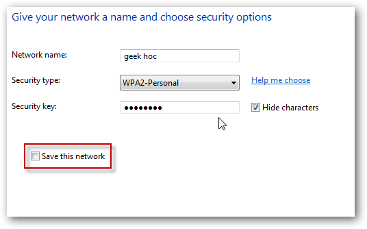 -পরবর্তী পর্যায়ে Network name এবং Security key নির্ধারণ করার অপশন দেয়া হবে। নির্ধারণ করার পর Save this network সিলেক্ট করতে হবে। অতএব, একটি বক্সে নেটওয়ার্ক সেট আপ হতে দেখা যাবে। এ পর্যায়ে কিছুক্ষণ অপেক্ষা করতে হবে।