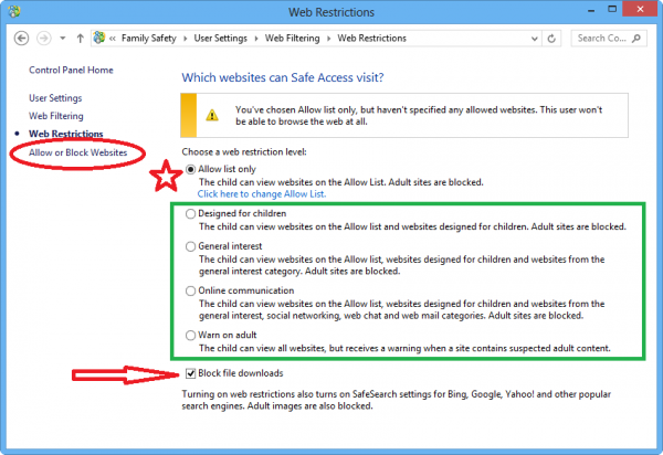 এখানে সবুজ বক্সের ভিতরে কয়েকটি ক্যাটাগরির ওয়েবসাইট আছে। কোন ক্যাটাগরি পর্যন্ত সাইট মুক্ত রাখতে চান তা সিলেক্ট করে দিন। যদি ডাউনলোড বন্ধ রাখতে চান তবে নিচের Block file downloads এ ক্লিক করুন। আর যদি নির্দিষ্ট কয়েকটি সাইট শুধু মাত্র খোলা রাখতে চান তবে Allow list only তে ক্লিক করুন। এখন আপনার Allow list এ যেসব website খোলা রাখতে চান সেগুলো যুক্ত করতে হবে। এ জন্য পাশের Allow or Block websites এ ক্লিক করুন। এতে Allow list আসবে। এখানে যেসব সাইট আপনি উন্মুক্ত রাখতে চান সেসব Web Address লিখে allow এ ক্লিক করে allow list এ যুক্ত করুন। তাহলে আপনার Allow list ছাড়া বাদ-বাকি সব সাইট ই ব্লক হয়ে যাবে ও access করা যাবে না।