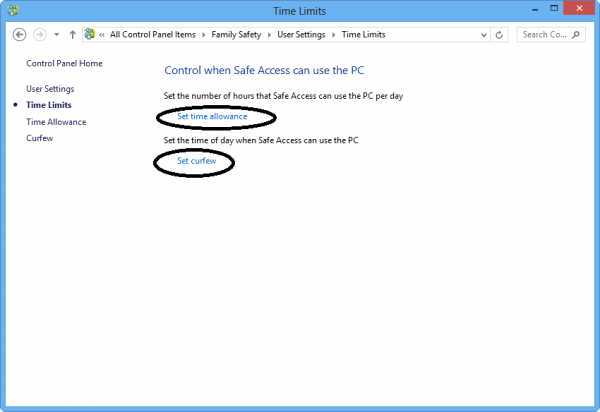 প্রথম অপশন Set time allowance, এই অপশন ব্যবহার করে আপনি সপ্তাহের কোন কোন দিন কত ঘন্টা করে user কাজ করতে পারবে তা নির্ধারন করে দিতে পারবেন। দ্বিতীয় অপশন set curfew, এই অপশন ব্যবহার করে দিনের কখন কখন user কাজ করতে পারবে তা নির্ধারন করে দিতে পারবেন। এই অপশন নির্ধারন করে দিলে সময় শেষ হবার ১৫ মিনিট আগে user কে warning দেবে কাজ গুছিয়ে log out করার জন্য।